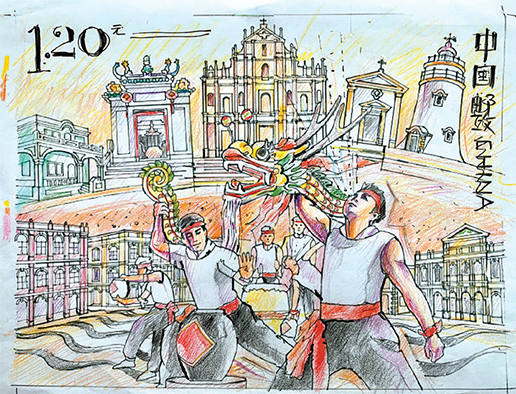 第2枚“中西薈萃 和諧共融”,議事廳前以分別手握龍頭與龍尾的舞醉龍師傅為前景,舞醉龍團(tuán)隊(duì)姿態(tài)各異,相互呼應(yīng),展現(xiàn)澳門舞醉龍的特色。背景為人們熟悉的澳門標(biāo)志性景觀大三巴牌坊、媽閣廟、東望洋燈塔,還有葡韻住宅式博物館?!巴ㄟ^中西建筑物的簡化圖形,反映澳門多元文化色彩和諧共融。在舞醉龍的紅、黃、黑、白等傳統(tǒng)色彩與葡式建筑的橘黃、玫紅與白色調(diào)糅合下,營造出歡快愉悅的氛圍?!表n秉華介紹。