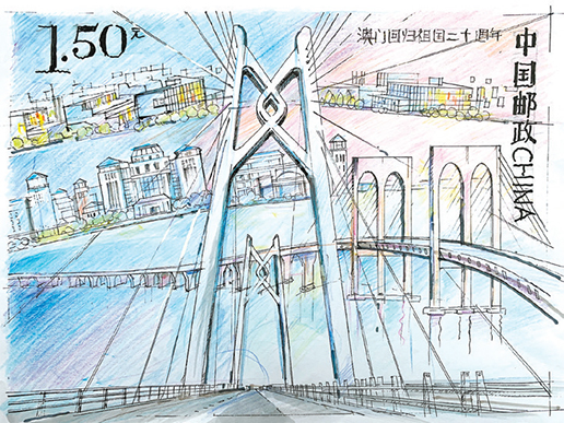 “《澳門回歸祖國二十周年》與《粵港澳大灣區(qū)》兩套郵票是今年5月同時(shí)約稿的,設(shè)計(jì)也是穿插進(jìn)行,因?yàn)槲覍Π拈T感受更為深刻,加之這套郵票的內(nèi)容相對集中,所以設(shè)計(jì)比較順利,在《粵港澳大灣區(qū)》郵票完成三周后就提交了這套郵票的圖稿?!表n秉華饒有興致地回憶道。