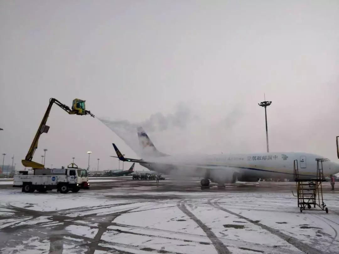 保障人員為郵航專機進行除冰作業(yè)