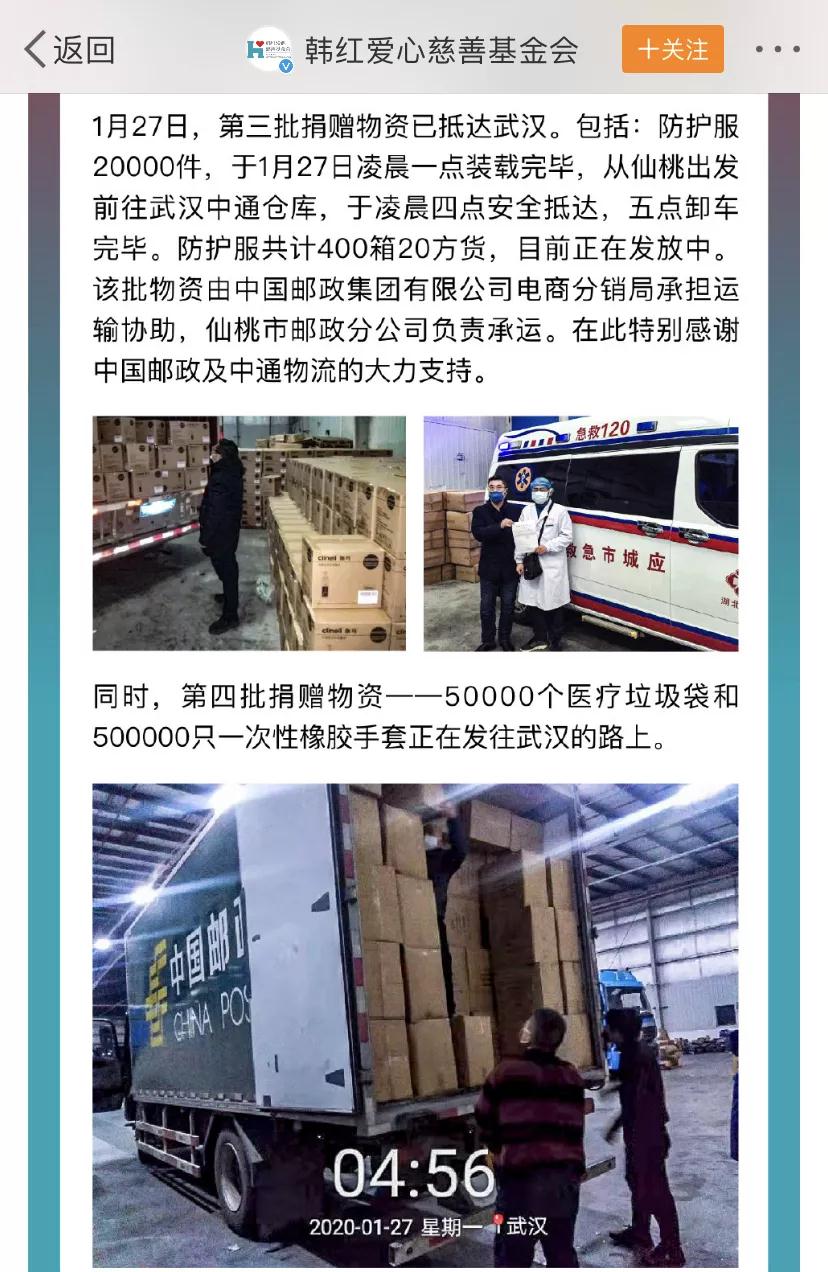 1月26日22時,湖北郵政收到由中國郵政集團有限公司轉(zhuǎn)發(fā),由北京韓紅愛心慈善基金會寄出的《關(guān)于請求幫助寄遞救援物資的函》。