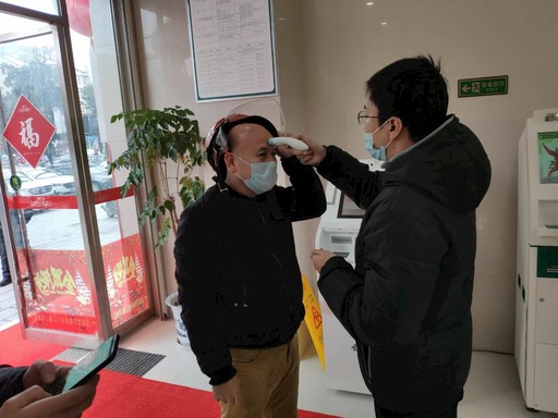 武穴市刊江路支行工作人員為客戶測量體溫。