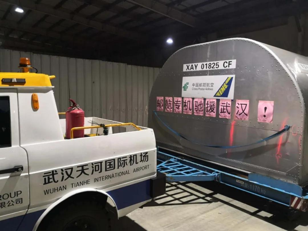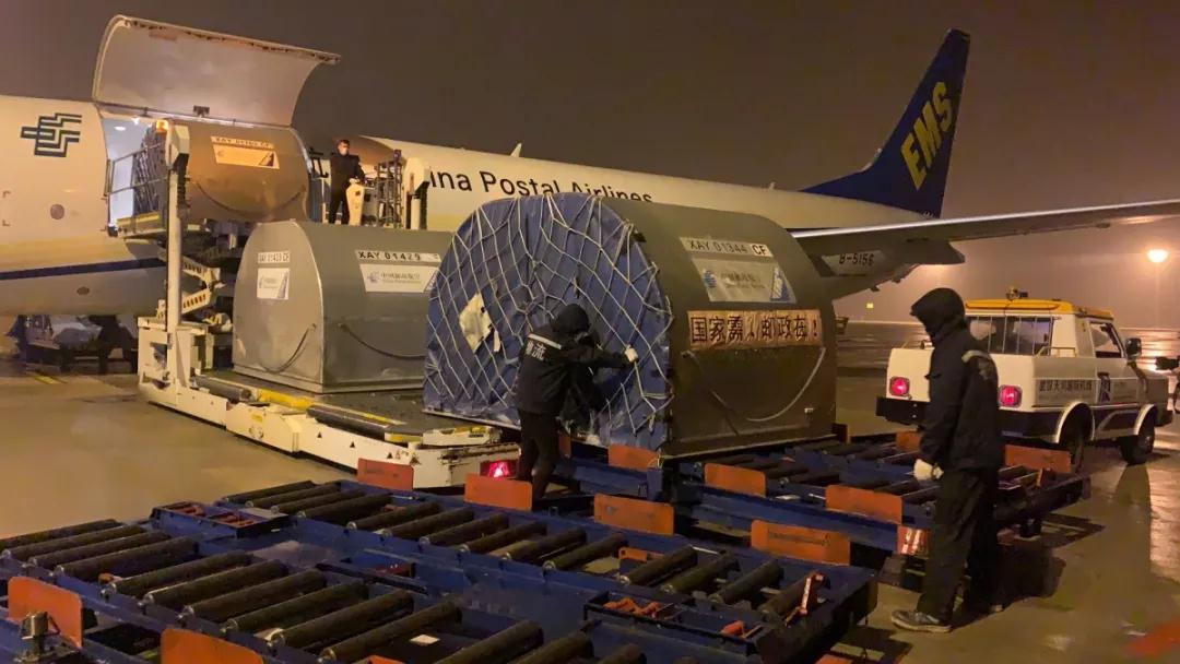 2月27日17時32分,中國郵政航空公司CF9121航班承載著總重1.618噸的16臺德國產(chǎn)ECMO設備及配套耗材從北京首都機場起飛,于19時16分在小雨中飛抵武漢天河機場,郵航武漢辦事處和天河機場地面保障部門第一時間展開卸機作業(yè),完成這批救命設備的空陸交接。