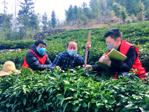 圖為“金融春風(fēng)服務(wù)隊(duì)”在茶園了解春茶追肥與生長情況,宣傳郵儲貸款產(chǎn)品?! 趵蠲?nbsp; 攝影報道
