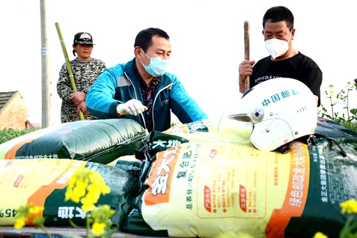 江蘇省射陽(yáng)縣郵政分公司開(kāi)展“戰(zhàn)疫情、搶農(nóng)時(shí)、郵我助,郵農(nóng)一心保春耕“活動(dòng),基層員工利用班前班后時(shí)間將農(nóng)民需要的復(fù)合肥配送到農(nóng)民家門口、田間地頭,并組織志愿者協(xié)助缺勞力戶為莊稼施肥鋤草。截至3月17日,該分公司已向全縣農(nóng)民配送復(fù)合肥546噸,幫助17戶缺勞力戶解除農(nóng)活上的后顧之憂。圖為通洋支局投遞員將肥料送到農(nóng)戶地頭?!鮿⒌铝?nbsp; 攝影報(bào)道