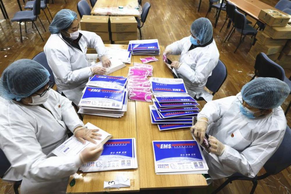 在青島郵政公司寄遞事業(yè)部,工作人員身著防護服,佩戴防護帽、口罩、手套,“全副武裝”忙碌著。他們加班加點將廠家送過來的口罩拆箱,然后裝進快遞袋中,再裝箱后分發(fā)到各區(qū)市郵政分公司的攬投部。所有工作人員進入裝件場地都要進行嚴(yán)格消毒等安全防護工作,確保配送給廣大市民的口罩郵件安全衛(wèi)生。