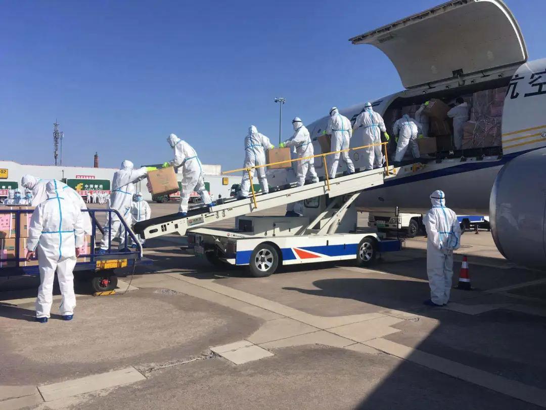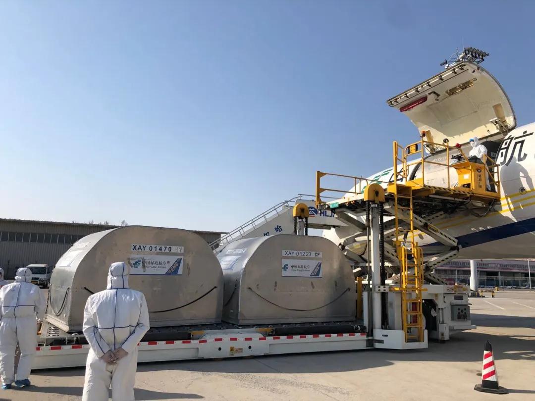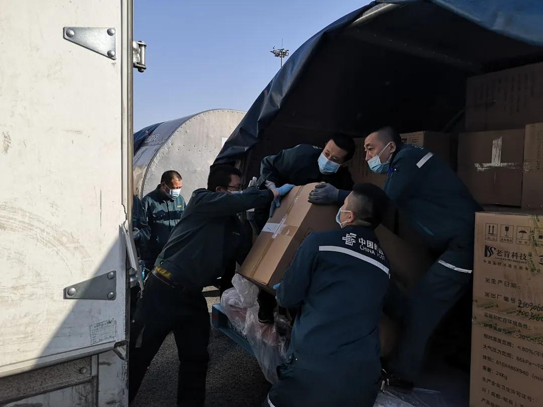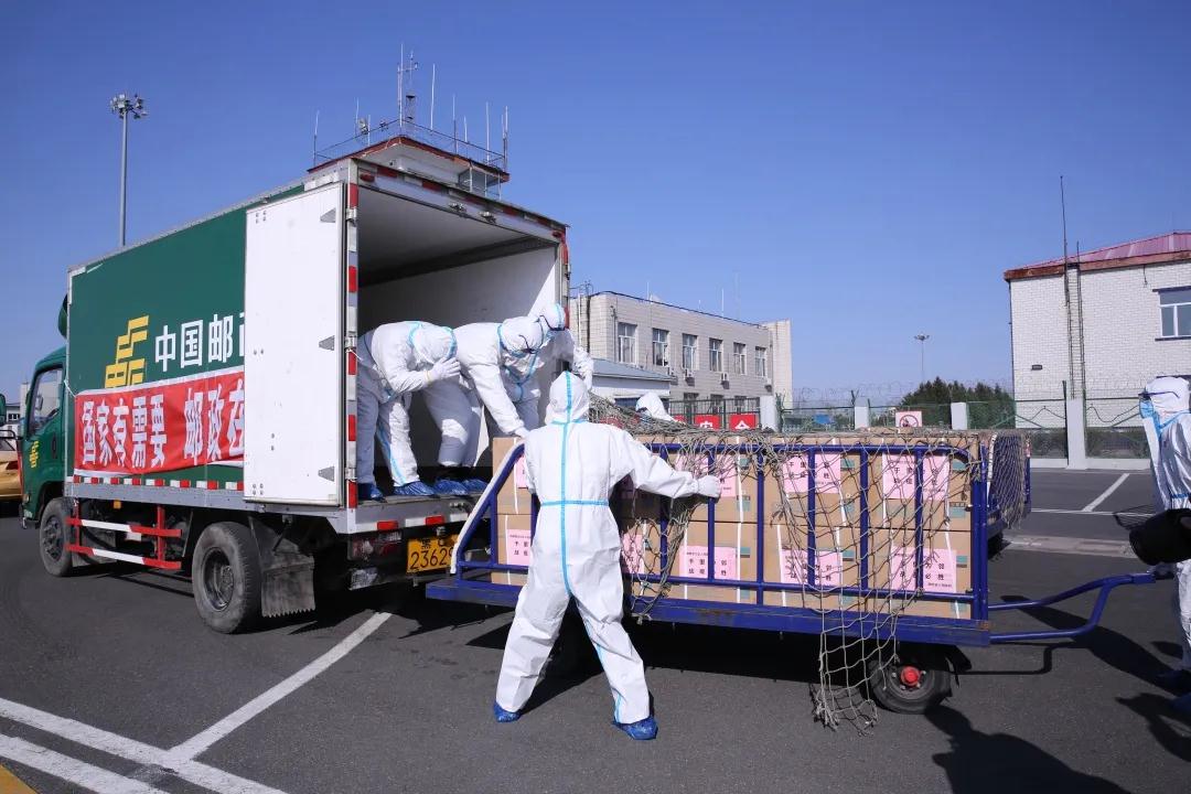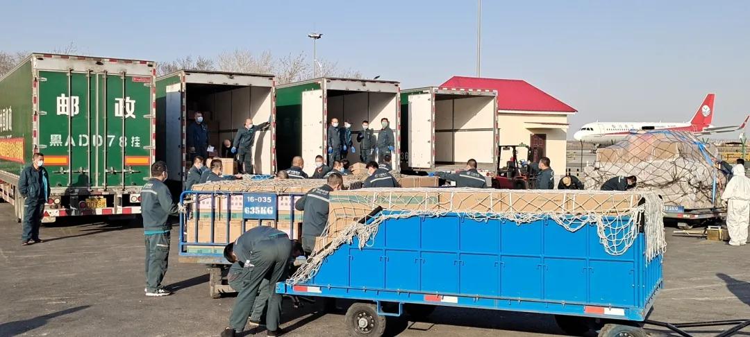 哈爾濱郵區(qū)中心局員工將郵航包機運抵的醫(yī)用物資進行裝車。