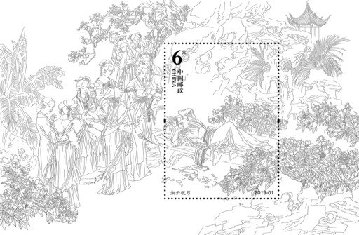 蕭玉田沒少花心思,他認真推敲構(gòu)圖,反復調(diào)整后,將小型張中心設計為郵票畫面,打上齒孔后是可以獨立出來又相對完整的只有一個人物的“湘云醉眠”畫面,人物、青石凳、芍藥、假山等構(gòu)成元素應有盡有,假山下部的虛化處理給面值、票名等文字留出了位置。齒孔內(nèi)的主體人物湘云及背景與齒孔外面的寶玉一眾人、芍藥、樹木、假山等有機組合成“S”形構(gòu)圖,又是一幅大景觀、多人物整體協(xié)調(diào)的“湘云眠芍”作品,齒孔內(nèi)外既相互獨立又整體統(tǒng)一,可分可合。