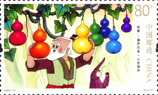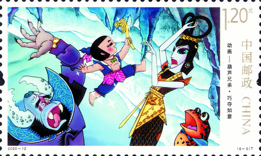 《葫蘆兄弟》故事情節(jié)復(fù)雜,場(chǎng)面變化大,人物也較多。人物就有七個(gè)葫蘆兄弟、老爺爺、蛇精、蝎子精和穿山甲等,而七個(gè)葫蘆兄弟性格特點(diǎn)和超能力也不一樣,都需要區(qū)別表現(xiàn)出來。從故事情節(jié)來說,不少是驚心動(dòng)魄、險(xiǎn)象環(huán)生的激烈較量場(chǎng)面。比如,第3枚郵票“絕路逢生”反映三娃大戰(zhàn)群妖,打得妖怪落花流水、抱頭鼠竄,畫面表現(xiàn)的是三娃用神力斬?cái)嘈泳膶毜?,蝎子精大驚失色的情形,此段畫面是故事的一個(gè)小高潮;再如第5枚郵票“巧奪如意”主要講述擁有隱身神力的六娃機(jī)智勇敢地盜取了蛇妖的寶貝“如意”,救出了幾位兄長(zhǎng),此段情節(jié)尤為精彩。