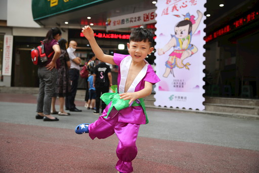 6月1日,重慶市沙坪壩區(qū)三峽廣場(chǎng)郵政支局門前,前來(lái)購(gòu)買《動(dòng)畫(huà)—葫蘆兄弟》郵票的小朋友和家長(zhǎng)絡(luò)繹不絕,郵票上栩栩如生的葫蘆兄弟形象吸引了小朋友的目光。三峽廣場(chǎng)支局還特意為到場(chǎng)的小朋友準(zhǔn)備了葫蘆兄弟同款服裝,供小朋友拍照留念。一位小朋友穿上葫蘆兄弟服裝后,在支局門前興奮地手舞足蹈。 □朱亞坤 攝影報(bào)道