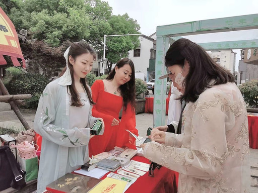 5月30日下午,為配合集市主題,集郵與文化傳媒部的工作人員早已換好漢服,梳著仿古發(fā)髻,在顯著攤位上擺放好了一應(yīng)產(chǎn)品。