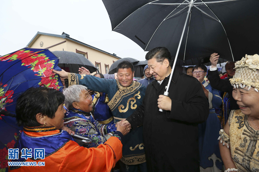 2014年春節(jié)前夕,習近平來到內(nèi)蒙古,看望慰問各族干部群眾。他來到錫林浩特市寶力根蘇木(鄉(xiāng))冬季那達慕,同牧民們一起觀摔跤,看賽馬,聽長調(diào),賞歌舞。在傳統(tǒng)的“五畜祈福”儀式上,他按照蒙古族習俗,用無名指蘸上銀碗盛著的鮮牛奶彈了三下,祝福來年風調(diào)雨順,五畜興旺,人民幸福安康。