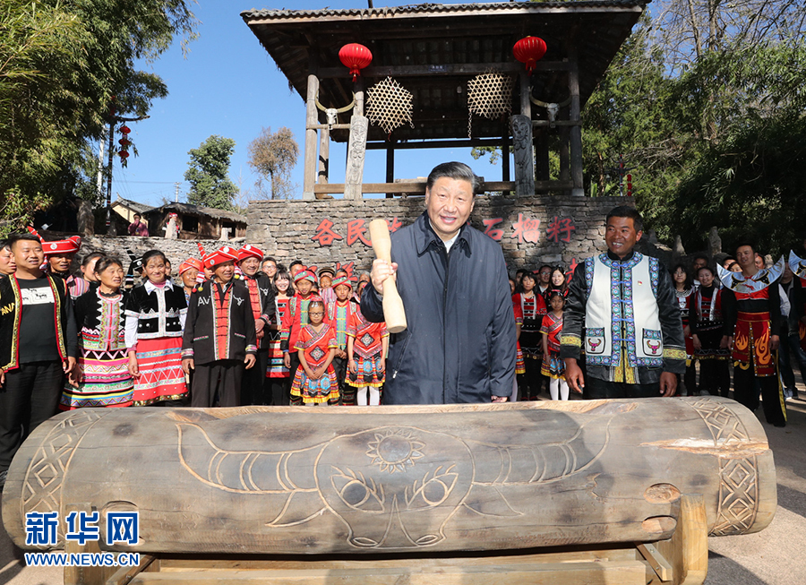 今年1月19日,正在云南考察的習近平來到騰沖市清水鄉(xiāng)三家村中寨司莫拉佤族村。司莫拉,佤語意為“幸福的地方”。習近平說,在大家努力下,你們這里已經(jīng)實現(xiàn)脫貧并正向新的發(fā)展目標努力邁進,可喜可賀。全面建成小康社會之后要全面推進鄉(xiāng)村振興,讓幸福的佤族村更加幸福!按照當?shù)亓曀?,習近平拿起鼓棒,敲響三聲木鼓,祝福風調(diào)雨順、國泰民安、四海升平,并向鄉(xiāng)親們致以新春祝福。