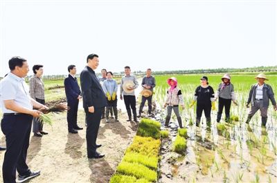 在黃河水滋養(yǎng)下,寧夏平原土地肥沃、物產(chǎn)豐富,素有“塞上江南”之稱。9日下午,習(xí)近平來到銀川市賀蘭縣稻漁空間鄉(xiāng)村生態(tài)觀光園,聽取寧夏現(xiàn)代農(nóng)業(yè)發(fā)展、農(nóng)業(yè)合作社帶動農(nóng)民增收致富運(yùn)營模式等情況匯報(bào),觀看寧夏特色農(nóng)產(chǎn)品展示,了解稻漁種養(yǎng)業(yè)融合發(fā)展的創(chuàng)新做法。習(xí)近平登上觀景塔,俯瞰園區(qū)全貌。微風(fēng)輕拂,秧苗搖曳,一派生機(jī)勃勃。他沿著田埂走進(jìn)稻田,同正在勞作的村民們親切交談。村民們告訴總書記,現(xiàn)在有土地流轉(zhuǎn)費(fèi)、勞務(wù)費(fèi),還有年底分紅,收入提高了,也有保障了。正值放魚時節(jié),習(xí)近平舀起魚苗、蟹苗,放進(jìn)田邊水渠。習(xí)近平強(qiáng)調(diào),發(fā)展現(xiàn)代特色農(nóng)業(yè)和文化旅游業(yè),必須貫徹以人民為中心的發(fā)展思想,突出農(nóng)民主體地位,把保障農(nóng)民利益放在第一位。要探索建立更加有效、更加長效的利益聯(lián)結(jié)機(jī)制,確保鄉(xiāng)親們持續(xù)獲益。要注意解決好稻水矛盾,采用節(jié)水技術(shù),積極發(fā)展節(jié)水型、高附加值的種養(yǎng)業(yè),保護(hù)好黃河水資源。目前,疫情防控形勢穩(wěn)步向好,要繼續(xù)抓好常態(tài)化疫情防控,加快恢復(fù)社會生產(chǎn)生活正常秩序。
