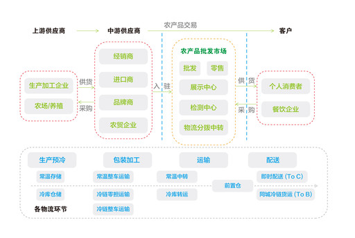 農(nóng)產(chǎn)品供應(yīng)鏈?zhǔn)且赞r(nóng)產(chǎn)品供應(yīng)為核心,由原材料供應(yīng)商、生產(chǎn)商、加工者、物流服務(wù)和消費(fèi)者等構(gòu)建的一種組織形式和網(wǎng)絡(luò)架構(gòu),涉及物流、資金流及信息流。其中,農(nóng)產(chǎn)品物流擔(dān)當(dāng)著暢通供需渠道的角色,對(duì)農(nóng)產(chǎn)品流通中人、貨、場(chǎng)資源的深度融合起著重要的支撐作用。與工業(yè)物流基本功能相似,農(nóng)產(chǎn)品物流也具備運(yùn)輸、儲(chǔ)存、流通、加工、配送、裝卸搬運(yùn)﹑包裝和信息處理等基本功能。從溫度、重量、速度的角度來(lái)看,又分別涉及冷鏈物流,農(nóng)產(chǎn)品零擔(dān)運(yùn)輸及近幾年興起的前置倉(cāng)、即時(shí)配送等。