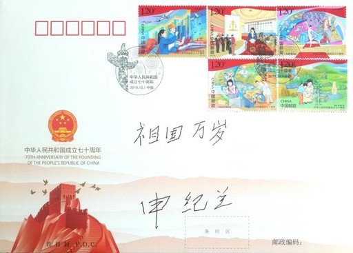 2019年10月,申紀(jì)蘭在《中華人民共和國(guó)成立七十周年》首日封上題字。