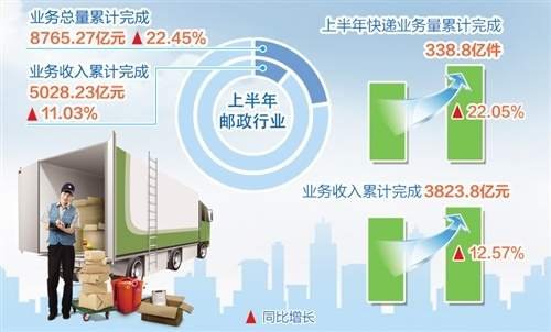 國家郵政局統(tǒng)計數(shù)據(jù)顯示,上半年,郵政快遞業(yè)逐漸擺脫新冠肺炎疫情影響逆勢上揚,主要經(jīng)濟(jì)指標(biāo)超過去年同期水平。1月至6月,郵政行業(yè)業(yè)務(wù)總量累計完成8765.27億元,同比增長22.45%;業(yè)務(wù)收入(不包括郵政儲蓄銀行直接營業(yè)收入)累計完成5028.23億元,增長11.03%。其中,快遞業(yè)務(wù)量完成338.8億件,增長22.05%,超過2016年全年(312.8億件);快遞業(yè)務(wù)收入完成3823.8億元,增長12.57%。