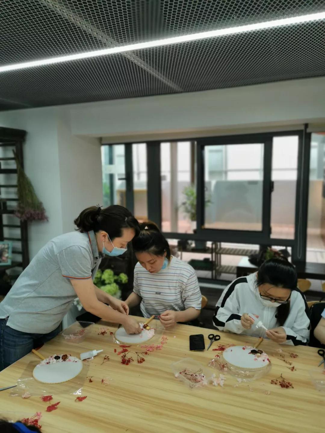 “對(duì),這里的花朵要剪碎一點(diǎn),做這個(gè)要耐心一些?!币晃焕蠋熣诮毯Mㄆ谪浌煞萦邢薰镜?0余位員工制作團(tuán)扇,這是活動(dòng)中心與該公司的團(tuán)建項(xiàng)目。為實(shí)現(xiàn)項(xiàng)目合作多元化,活動(dòng)中心主動(dòng)和周邊企業(yè)共建,從以承接活動(dòng)為主向樞紐型平臺(tái)良性發(fā)展,以樞紐型陣地騰籠換鳥(niǎo),引入優(yōu)質(zhì)的工作室資源,不斷輻射附近樓宇白領(lǐng),吸引白領(lǐng)成為常駐粉絲,更加高效的推進(jìn)基層文化服務(wù)。
