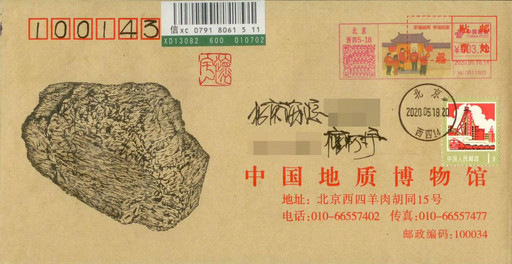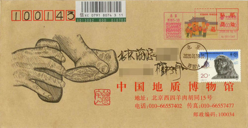 燧石俗稱“火石”,是一種含硅、質密堅硬的巖石,破碎后形成鋒利的斷口,對敲產生火星,能夠引燃干草木。相傳,燧石取火法是燧人氏發(fā)明的,這種更簡易的取火方式讓人類得以真正控制火種、掙脫黑暗的束縛。在這枚“燧石取火”手繪封上,我加貼了“北京猿人”郵票,雖然他們已經離我們遠去,但火種將我們聯(lián)系在了一起,作為“晚期智人”的后代,我向他們致以問候。