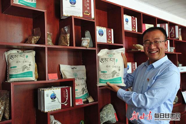 郵儲銀行甘肅省分行扶貧工作辦公室高級副經(jīng)理、碌曲縣阿拉鄉(xiāng)吉扎村駐村幫扶工作隊(duì)隊(duì)長兼第一書記齊斌展示扶貧車間生產(chǎn)的青稞炒面