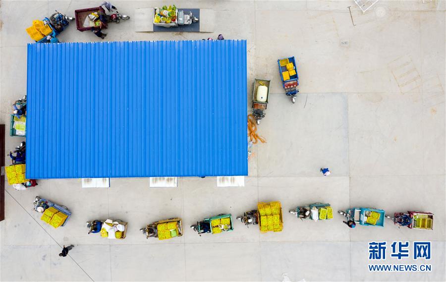 在寧夏紅寺堡區(qū)柳泉鄉(xiāng)柳泉村黃花菜晾曬場,村民排隊(duì)稱重黃花菜(7月11日攝,無人機(jī)照片)。 新華社記者 楊植森 攝