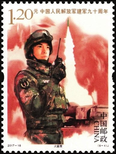 2017年8月1日中國郵政發(fā)行了2017-18《中國人民解放軍建軍九十周年》紀(jì)念郵票1套6枚,小型張1枚。圖案內(nèi)容分別為:陸軍、海軍、空軍、火箭軍、戰(zhàn)略支援部隊(duì)、武裝警察部隊(duì),小型張內(nèi)容為聽黨指揮。該套郵票展現(xiàn)了中國人民解放軍的颯爽英姿和中國軍事作戰(zhàn)裝備的硬件實(shí)力,主題鮮明,磅礴大氣,畫面具有強(qiáng)烈的動感和威嚴(yán)的氣勢。小型張上軍旗飄揚(yáng),各軍種英姿颯爽,背景襯托各軍種高尖端裝備,描繪了我軍戰(zhàn)士聯(lián)合作戰(zhàn)的畫面,既表現(xiàn)了中國人民解放軍威武雄壯的軍容和現(xiàn)代化水平,也體現(xiàn)出黨的十八大以來,人民軍隊(duì)在新時(shí)代強(qiáng)軍目標(biāo)指引下所取得的巨大成就。