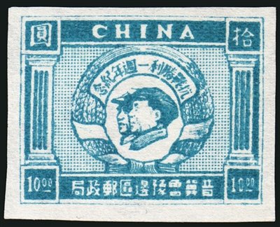 2.抗戰(zhàn)勝利后,各根據(jù)地陸續(xù)發(fā)行了抗戰(zhàn)勝利紀(jì)念郵票。晉察冀邊區(qū)于1945年到1946年發(fā)行的該題材郵票主圖為“八路健兒疆場殺敵圖”,并且以此圖案發(fā)行過兩次郵票,根據(jù)票幅大小不同分別稱作“抗戰(zhàn)勝利紀(jì)念大型郵票”(俗稱“大抗戰(zhàn)”)和“抗戰(zhàn)勝利紀(jì)念小型郵票”(俗稱“小抗戰(zhàn)”)。晉冀魯豫邊區(qū)分別于1947年3月和7月發(fā)行了“抗戰(zhàn)勝利一周年紀(jì)念郵票”和“抗戰(zhàn)勝利二周年紀(jì)念郵票”,兩套郵票主圖相同,顏色不同,均為毛澤東主席和朱德總司令的側(cè)面像,這是抗戰(zhàn)期間指揮邊區(qū)軍民抗擊日寇的兩位領(lǐng)袖。東北區(qū)1947年發(fā)行了三種紀(jì)念抗戰(zhàn)的郵票,7月7日發(fā)行的“七七”抗戰(zhàn)十周年紀(jì)念郵票及小全張,主圖為一只有力的手臂緊握一支步槍,表示面對敵人的侵略,全民抗戰(zhàn)的決心;8月15日發(fā)行的“八一五”東北解放二周年紀(jì)念郵票,主圖為陽光照射下的白山黑水,兩側(cè)為大豆、高粱,表現(xiàn)解放后的東北豐衣足食,生活美好;9月18日發(fā)行的“九一八”紀(jì)念郵票,主圖為東三省地圖,兩側(cè)分別為“反對美蔣反動派制造二次滿洲國”的文字,在紀(jì)念“九一八”事變的同時,也宣傳了當(dāng)時的斗爭形式。山東區(qū)發(fā)行的“抗日民族戰(zhàn)爭勝利紀(jì)念郵票”,主圖是毛澤東揮手指引人民奔向光明的前程,表示勝利后,人民希望建立一個富強(qiáng)民主的新中國的美好愿望。東北區(qū)還于1949年8月15日發(fā)行了“八一五”四周年紀(jì)念郵票,主圖為東北抗日暨愛國自衛(wèi)戰(zhàn)爭烈士紀(jì)念塔。1946年12月,山東區(qū)發(fā)行了“膠東抗日烈士紀(jì)念塔圖郵票”,主圖為紀(jì)念塔,緬懷膠東抗戰(zhàn)中犧牲的烈士。