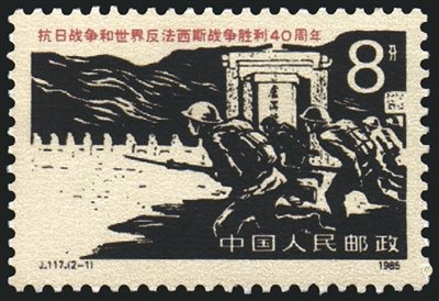 3.新中國成立后發(fā)行的抗戰(zhàn)紀(jì)念郵票,郵票主圖取材廣泛,圖案名稱多用抗戰(zhàn)史實(shí)名稱來命名。1952年7月7日發(fā)行的紀(jì)16“抗日戰(zhàn)爭十五周年紀(jì)念”郵票,分別為“盧溝橋風(fēng)云”“平型關(guān)勝利”“歡送新四軍抗日”“領(lǐng)袖策劃反攻”,4枚郵票圖案定格抗戰(zhàn)中4個有代表性的場景。1965年9月3日發(fā)行的紀(jì)115“紀(jì)念抗日戰(zhàn)爭勝利二十周年”郵票,1套4枚,“毛主席在著作”一圖描繪了毛澤東在延安窯洞里寫作《論持久戰(zhàn)》的情景;“八路軍東渡黃河”郵票圖案為八路軍戰(zhàn)士在黃河邊準(zhǔn)備東渡,奔赴抗日戰(zhàn)爭前線的場面;“人民戰(zhàn)爭勝利”主圖為取得抗日戰(zhàn)爭勝利的八路軍、新四軍和游擊隊(duì)?wèi)?zhàn)士在歡呼勝利的場景;“光榮參軍”主圖為人民群眾積極參加人民軍隊(duì),加入抗戰(zhàn)隊(duì)伍的情景。1985年9月3日發(fā)行的J.117“抗日戰(zhàn)爭和世界反法西斯戰(zhàn)爭勝利40周年”郵票,1套2枚,“盧溝橋中國軍隊(duì)奮起抗日”描繪了抗日戰(zhàn)爭中國民黨二十九軍將士沖鋒陷陣、奮勇抗戰(zhàn)的英雄形象;“八路軍和民兵戰(zhàn)斗在長城內(nèi)外”展現(xiàn)了八路軍配合民兵浴血奮戰(zhàn),共同打擊日寇的光輝形象。1995年9月3日發(fā)行的“抗日戰(zhàn)爭和世界反法西斯戰(zhàn)爭勝利五十周年”郵票,1套8枚,分別為“戰(zhàn)火”“臺兒莊大捷”“百團(tuán)大戰(zhàn)”“敵后游擊戰(zhàn)”“芒友會師”“華僑捐獻(xiàn)”“臺灣光復(fù)”“偉大勝利”。分別描繪了盧溝橋戰(zhàn)斗、臺兒莊大捷、百團(tuán)大戰(zhàn)、敵后游擊戰(zhàn)、芒友會師的場景,以及華僑捐獻(xiàn)、歡慶臺灣光復(fù)、日本正式投降簽字儀式的勝利場面。2005年8月15日發(fā)行的“中國人民抗日戰(zhàn)爭暨世界反法西斯戰(zhàn)爭勝利六十周年”郵票,1套4枚及1枚小型張,“全民抗戰(zhàn)”展現(xiàn)的是國共兩黨軍隊(duì)和人民群眾并肩作戰(zhàn)的場面;“中流砥柱”主圖為一名八路軍戰(zhàn)士吹響沖鋒號,展現(xiàn)了八路軍在抗戰(zhàn)中的重要作用;“諾曼底登陸”主圖為登陸后手持步槍的美軍士兵;“攻克柏林”主圖為蘇軍歡呼勝利的場景;小型張主圖為一只沖破鐵絲網(wǎng)的白色和平鴿,寓意和平與正義沖破了戰(zhàn)爭的主題。2015年9月3日發(fā)行的“中國人民抗日戰(zhàn)爭暨世界反法西斯戰(zhàn)爭勝利七十周年”郵票,1套13枚及1枚小型張,郵票圖案背景表現(xiàn)的是中國抗戰(zhàn)中的13個經(jīng)典事件場面,主圖是與該事件相關(guān)的紀(jì)念場館:“九一八”歷史博物館、東北烈士紀(jì)念館、中國人民抗日戰(zhàn)爭紀(jì)念館、上海淞滬抗戰(zhàn)紀(jì)念館、侵華日軍南京大屠殺遇難同胞紀(jì)念館、臺兒莊大戰(zhàn)紀(jì)念館、延安革命紀(jì)念館、八路軍總部舊址紀(jì)念館、百團(tuán)大戰(zhàn)紀(jì)念館、平型關(guān)大捷紀(jì)念館、冉莊地道戰(zhàn)紀(jì)念館、新四軍紀(jì)念館、滇西抗戰(zhàn)紀(jì)念館;小型張畫面以《大刀進(jìn)行曲》雕塑為主圖,高度概括、反映了全民抗戰(zhàn)的主題。