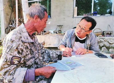 郝軍(右)向有經(jīng)驗的村民請教種田經(jīng)驗?!鯒蠲?攝