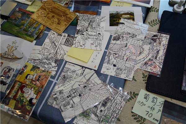 集市上有個(gè)“太陽(yáng)島”的攤位吸引了很多觀眾,這里的明信片都是手繪的,因?yàn)閿傊鲉贪彩撬孛钀?ài)好者。攤位上,最吸引觀眾的是她手繪上海每個(gè)角落的明信片,據(jù)喬安介紹,她會(huì)和小伙伴們一起去上海的角角落落去寫(xiě)生,平時(shí)在地鐵上也會(huì)拿著小本子畫(huà)車廂里的乘客,他們尋訪了藏書(shū)樓、尼姑庵、書(shū)院等遺跡。還有一些是想象結(jié)合現(xiàn)實(shí)的素材繪制的。她畫(huà)的最多的就是老城廂的人和街道,比如小南門、老西門一帶。這一次她從日常積累的作品里篩選了17張印刷成了明信片,希望把自己捕捉到的舊世界和幻想中的場(chǎng)景展現(xiàn)給大家。