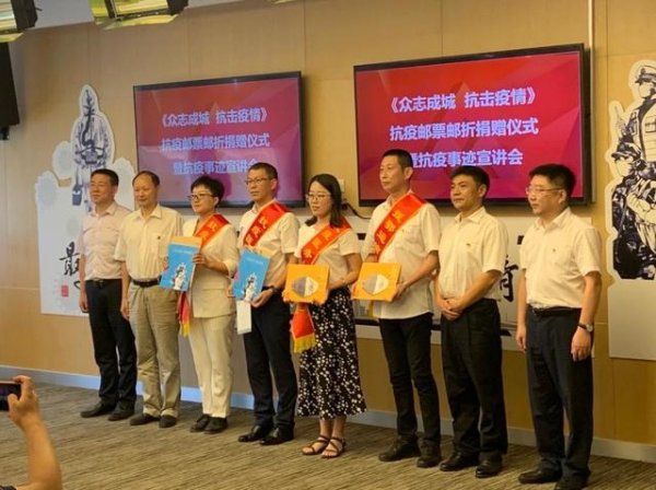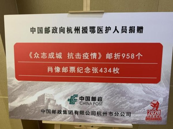 8月20日上午,在杭州郵政分公司大樓的報(bào)告廳,由杭州市衛(wèi)生健康委員會(huì)、杭州市市郵政管理局、杭州郵政分公司聯(lián)合舉辦《眾志成城 抗擊疫情》郵折捐贈(zèng)儀式。杭州郵政分公司向杭州援鄂抗疫醫(yī)務(wù)工作者捐贈(zèng)《眾志成城 抗擊疫情》郵票郵折共計(jì)958套;肖像郵票紀(jì)念張434張。此次捐贈(zèng)給醫(yī)務(wù)工作者的《眾志成城 抗擊疫情》紀(jì)念郵折,是中國郵政特別發(fā)行的郵票,用于銘記中國力量和中國精神,并將郵票發(fā)行收入捐獻(xiàn)用于救災(zāi)抗疫。