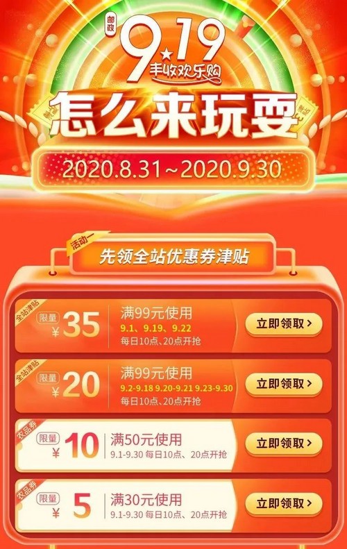 專題首頁> > 中國郵政集團有限公司 > 個性化專題 > 郵政919 豐收歡樂購 > 走進(jìn)919 > 燃爆9月!郵政919豐收歡樂購讓你連嗨1個月...