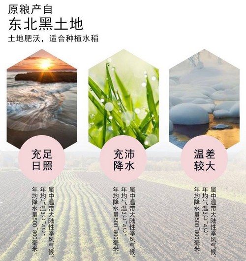 吉林地處北緯41-46°擁有肥沃的黑土地,長(zhǎng)白山源頭水灌溉,是世界唯一“黃金水稻生產(chǎn)帶”。日照充足、水源優(yōu)質(zhì)、肥沃黑土、氣侯適宜孕育出中國(guó)最為優(yōu)質(zhì)的吉林大米。