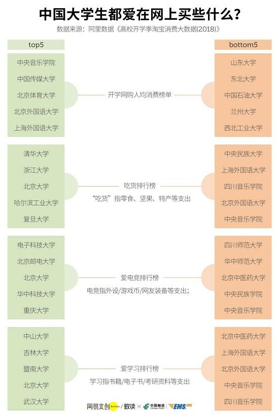 根據往年的數據,大學開學季,中國高校大學生網購消費,往往會達到一個小高峰。阿里數據則顯示,開學網購人均消費高校榜單中,中央音樂學院、中國傳媒大學、北京體育大學,以最高的人均消費排名前三。