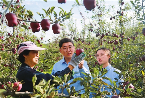 中秋時(shí)節(jié),郵儲銀行甘肅省天水市分行信貸員走進(jìn)天水市麥積區(qū)農(nóng)業(yè)產(chǎn)業(yè)化重點(diǎn)龍頭企業(yè)潘引軍合作社,實(shí)地了解郵儲銀行信貸支持合作社蘋果種植情況。合作社社員隨手從掛滿果實(shí)的樹枝上摘下一個(gè)沉甸甸的蘋果,遞給信貸員看。信貸員望著眼前帶著果香的大蘋果,脫口而出:“今年這蘋果,真棒!”