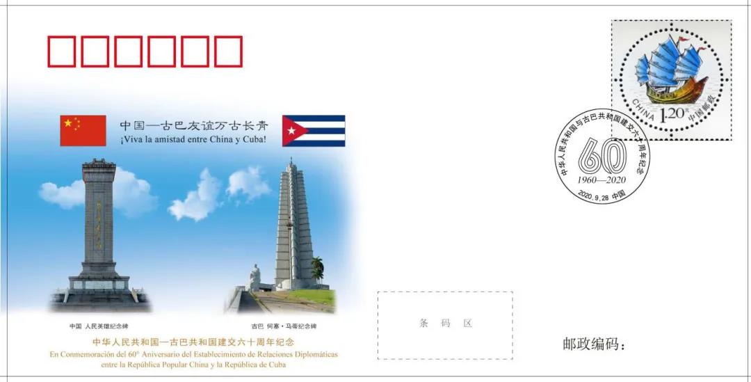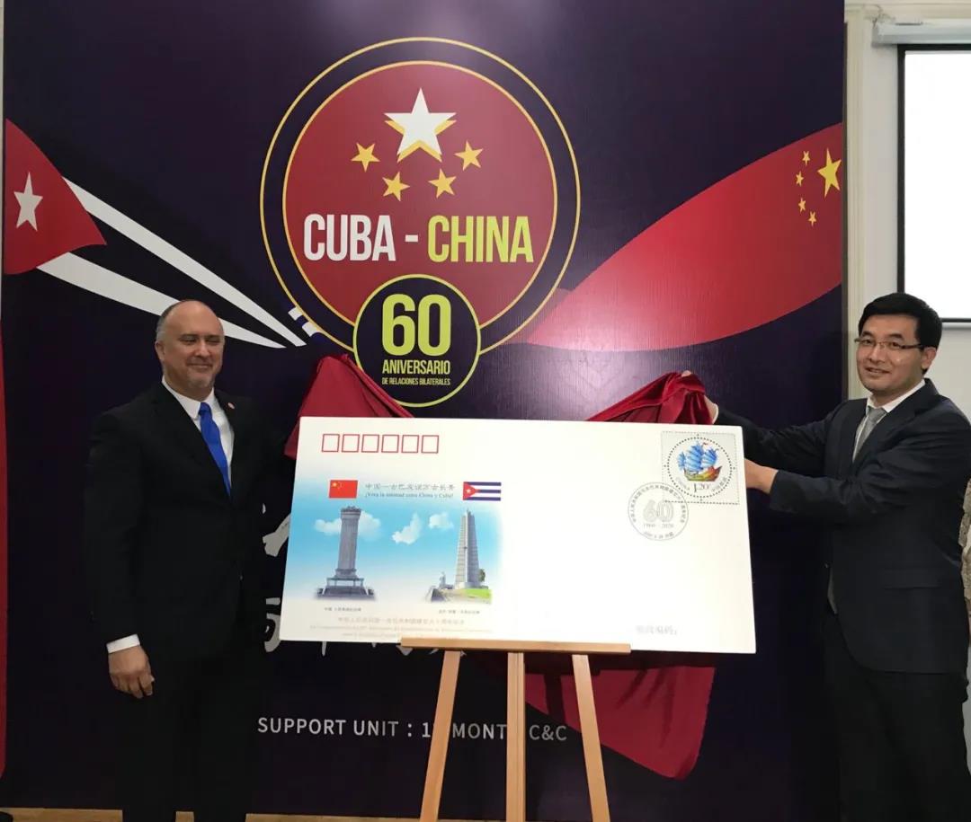 9月28日是中國古巴建交60周年紀念日。古巴駐華大使館舉行慶祝招待會,國務委員兼外長王毅出席。為了紀念這個特殊的日子,中國集郵總公司特發(fā)行外交紀念封一枚。招待會上,中國郵政集團有限公司總經(jīng)理張金良與古巴駐華大使佩雷拉共同為紀念封揭幕,張金良代表中國郵政集團有限公司向古巴大使館贈送紀念封。