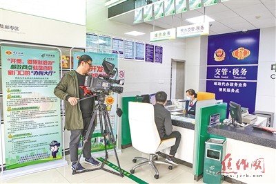 圖為中央電視臺記者在市郵政分公司龍源湖郵政支局采訪“稅郵雙代”業(yè)務(wù)。王成 攝