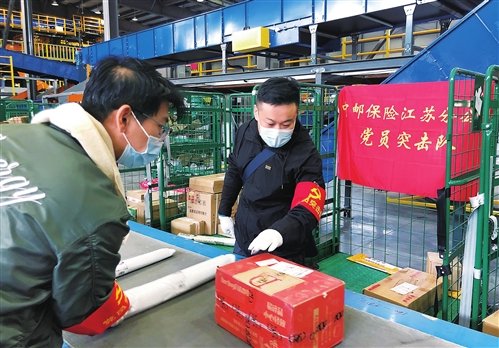 圖為中郵保險(xiǎn)江蘇分公司黨員突擊隊(duì)忙碌在郵件裝運(yùn)現(xiàn)場。
