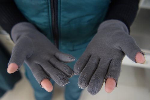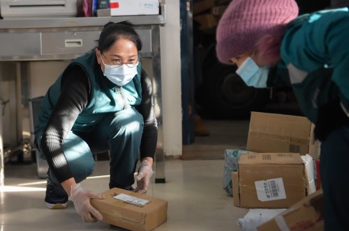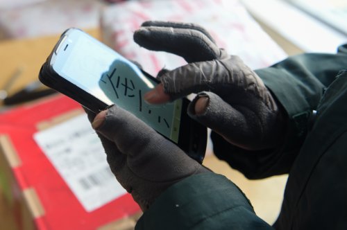 每天上午八點(diǎn)半,韓金花就開始工作,要一直忙碌到天黑。為了御寒,韓金花提前準(zhǔn)備了暖足貼,外出工作時(shí)貼到腳上。她在手套的拇指與食指部分剪了洞,露出手指,方便在設(shè)備中錄入快遞信息。寒冬里,手指經(jīng)常凍得失去知覺?!敖衲?0月份我就要退休了,我要站好最后一班崗。”她說。