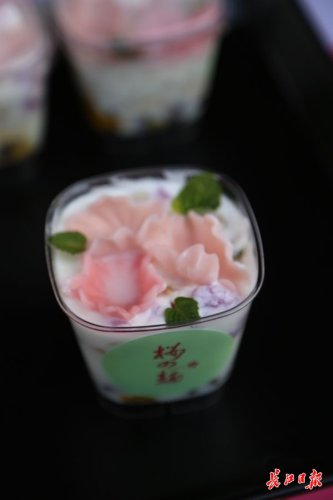 據(jù)了解,這種“櫻花面”,是用特殊模具生產(chǎn)的櫻花瓣形狀的面片。在現(xiàn)場,幾朵煮熟的櫻花面片,就像一朵朵粉色的櫻花,軟軟萌萌,很是可愛;與水果、芝士搭配,再點(diǎn)綴幾片新鮮薄荷,這樣的日系美食很受女孩喜歡。