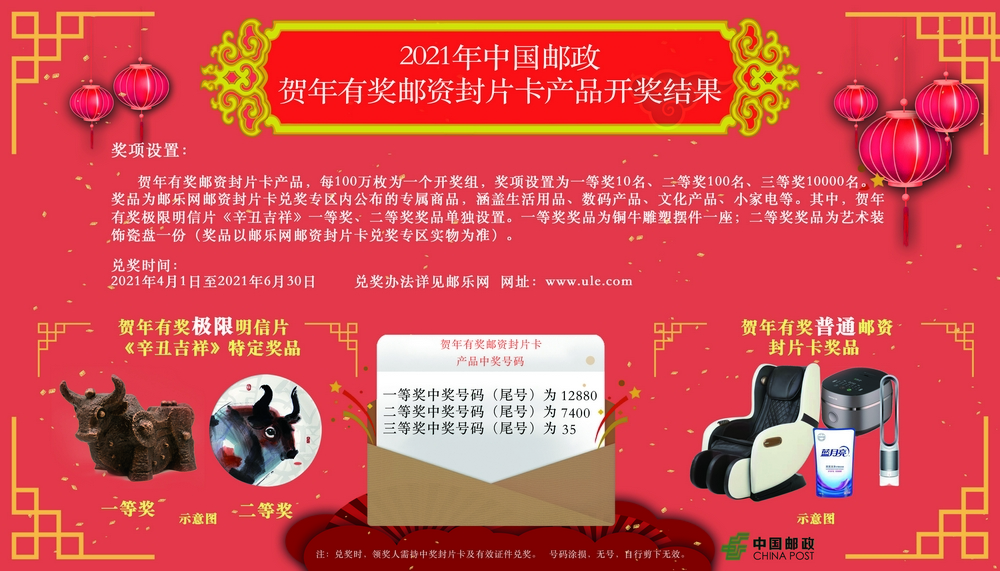 2021年賀年有獎郵資封片卡中獎號碼于3月26日產(chǎn)生。現(xiàn)將具體中獎信息通知如下:
