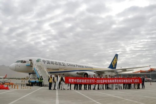 5月25日5點23分,一架噴涂著中國郵政航空的波音757-200飛機,從四川成都雙流國際機場起飛,7點17分安全飛抵西藏拉薩貢嘎國際機場,后續(xù)按計劃順利完成在拉薩貢嘎機場全發(fā)起飛、進近以及模擬單發(fā)失效復(fù)飛等計劃驗證科目。至此,由民航北京監(jiān)督管理局組織的中國郵政航空高高原和RNP AR程序驗證試飛取得了圓滿成功,在西藏和平解放70周年之際,“祝賀中國郵政航空B757-200拉薩機場高高原航線實地驗證試飛成功”的橫幅,在高原上獵獵展開。
