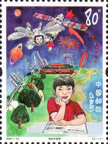 登上《兒童畫作品選》特種郵票的3幅作品“我的中國夢”“國粹之韻”和“希望與夢想”,分別由上海市同濟小學的楊曉芒、合肥新站壽春實驗中學的費玉婷、上海市周浦第三小學的錢昕逸3位小朋友設計。第一枚通過描繪我國航空航天事業(yè)、城市、交通網絡繁榮發(fā)展等場景,表達了少年兒童不斷追尋探索宇宙的夢想以及對未來美好生活的憧憬;第二枚描繪了傳統(tǒng)文化與城市發(fā)展、現(xiàn)代科技共繁榮的場景,表達了少年兒童對中華優(yōu)秀文化的熱愛與傳承;第三枚描繪了偉大祖國不斷發(fā)展的場景,少年兒童登高望遠、憧憬未來。三枚郵票緊密圍繞主題,展現(xiàn)出少年兒童對黨領導下的偉大祖國的無比熱愛、由衷禮贊和美好祝愿。