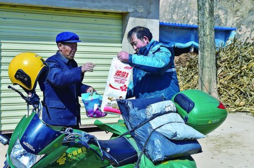 在趙滿明的摩托車上,經(jīng)常會(huì)出現(xiàn)與工作“不相符”的物品,有時(shí)是衛(wèi)生紙等生活用品,有時(shí)是瓜果蔬菜,這都是他幫投遞區(qū)域內(nèi)生活不便的群眾代買的物品?!拔颐刻於紒?lái)往在鎮(zhèn)上,幫他們代買一些生活用品,都是舉手之勞?!壁w滿明輕描淡寫地說(shuō)。