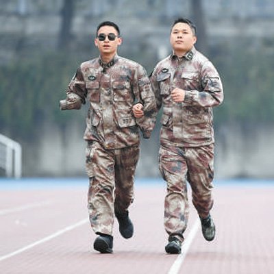 2020年1月2日,“排雷英雄戰(zhàn)士”杜富國(左)和戰(zhàn)友在陸軍軍醫(yī)大學(xué)操場上跑步。新華社記者 王全超 攝