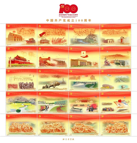 紀(jì)念郵票內(nèi)容為:1.開天辟地。表現(xiàn)元素:上海黨的一大會址、嘉興南湖紅船、“五四”運(yùn)動(人民英雄紀(jì)念碑浮雕)、旭日東升。2.崢嶸歲月。表現(xiàn)元素:南昌起義(人民英雄紀(jì)念碑浮雕)、井岡山革命遺址、遵義會議遺址、飛奪瀘定橋。3.中流砥柱。表現(xiàn)元素:延安寶塔山、《論持久戰(zhàn)》、抗日戰(zhàn)爭(人民英雄紀(jì)念碑浮雕)。4.偉大勝利。表現(xiàn)元素:西柏坡、香山雙清別墅、渡江戰(zhàn)役(人民英雄紀(jì)念碑浮雕)。5.開國大典。表現(xiàn)元素:開國大典時的天安門、華表、禮花。6.抗美援朝。表現(xiàn)元素:跨過鴨綠江、凱旋門、和平鴿、橄欖枝。7.制度奠基。表現(xiàn)元素:五四憲法、人民大會堂、社會主義改造。8.自力更生。表現(xiàn)元素:兩彈一星、大慶油田、南京長江大橋、十三陵水庫。9.改革春潮。表現(xiàn)元素:十一屆三中全會公報、小崗村大包干紀(jì)念雕塑、恢復(fù)高考。10.對外開放。表現(xiàn)元素:深圳拓荒牛雕塑、上海南浦大橋和廈門、珠海、汕頭經(jīng)濟(jì)特區(qū)。11.世紀(jì)騰飛。表現(xiàn)元素:三峽大壩、香港金紫荊雕塑、澳門金蓮花雕塑、中國加入世貿(mào)組織、上海APEC會議。12.科學(xué)發(fā)展。表現(xiàn)元素:神舟五號、青藏鐵路、蛟龍?zhí)栞d人潛水器、國家體育場(鳥巢)。13.擺脫貧困。表現(xiàn)元素:十八洞村、閩寧鎮(zhèn)、懸崖村、農(nóng)村豐收場景、無人機(jī)播撒、光伏發(fā)電等。14.全面小康。表現(xiàn)元素:GDP突破100萬億、生態(tài)文明(兩山理論)、教育、醫(yī)療、抗擊疫情等成就。15.強(qiáng)軍興軍。表現(xiàn)元素:古田全軍政治工作會議、閱兵方隊、國產(chǎn)航母山東艦、殲20、東風(fēng)41導(dǎo)彈和信息化作戰(zhàn)裝備。16.揚(yáng)帆遠(yuǎn)航。表現(xiàn)元素:現(xiàn)代巨輪、中國夢、56個民族、“一帶一路”、復(fù)興號高鐵、大興機(jī)場、北斗衛(wèi)星等。17.信仰。表現(xiàn)元素:“信仰”雕塑,襯托背景為泰山圖案。18.偉業(yè)。表現(xiàn)元素:“偉業(yè)”雕塑,襯托背景為壺口瀑布圖案。19.攻堅。表現(xiàn)元素:“攻堅”雕塑,襯托背景為長江圖案。20.追夢。表現(xiàn)元素:“追夢”雕塑,襯托背景為長城圖案。紀(jì)念郵票總面值24元。紀(jì)念郵票采用連票設(shè)計形式,以紅色、金色為畫面主基調(diào),運(yùn)用油畫寫實(shí)手法表現(xiàn),并采用連綿不斷的飄帶貫穿整體,寓意中國共產(chǎn)黨百年奮斗的光輝歷程。
