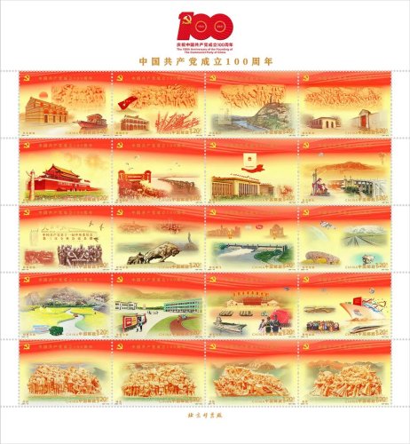 按照中國共產(chǎn)黨成立100周年慶?;顒?dòng)安排,經(jīng)報(bào)請(qǐng)黨中央批準(zhǔn),中國郵政將于2021年7月1日發(fā)行《中國共產(chǎn)黨成立100周年》紀(jì)念郵票1套20枚,紀(jì)念封1套1枚。此次活動(dòng)發(fā)布了紀(jì)念郵票的詳細(xì)信息,內(nèi)容分別為:1.開天辟地;2.崢嶸歲月;3.中流砥柱;4.偉大勝利;5.開國大典;6.抗美援朝;7.制度奠基;8.自力更生;9.改革春潮;10.對(duì)外開放;11.世紀(jì)騰飛;12.科學(xué)發(fā)展;13.擺脫貧困;14.全面小康;15.強(qiáng)軍興軍;16.揚(yáng)帆遠(yuǎn)航;17.信仰;18.偉業(yè);19.攻堅(jiān);20.追夢(mèng)。郵票采用連票設(shè)計(jì)形式,以紅色、金色為畫面主基調(diào),運(yùn)用油畫寫實(shí)手法表現(xiàn),并采用連綿不斷的飄帶貫穿整體,寓意中國共產(chǎn)黨百年奮斗的光輝歷程。該套郵票特別使用兩色紅熒光油墨,在紫光燈下,慶祝建黨百年標(biāo)識(shí)、“一大會(huì)址”、“天安門”等郵票主體元素閃放璀璨的光芒。