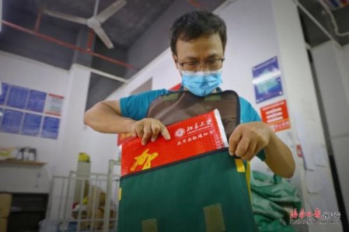 盧志強將錄取通知書快件裝進工作包里,準備外出投遞。海南日報記者 張茂 攝