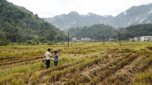 10月6日,雙峰郵政所的郵遞員吳文清(左)將貨物送給一名在田間勞作的村民手中。