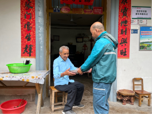 下一站是同村村民翁錫友家,他正跟幾個村民一起里外忙活??吹洁嵭l(wèi)星來了,幾個人便紛紛迎上來問好,“在忙什么”“吃了沒”……短暫寒暄后,幾個人很默契地快速分走了鄭衛(wèi)星手上的信件、報刊和包裹。