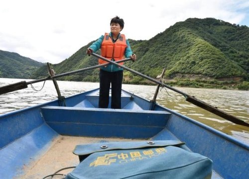 投遞路上,趙明翠劃船橫渡漢江